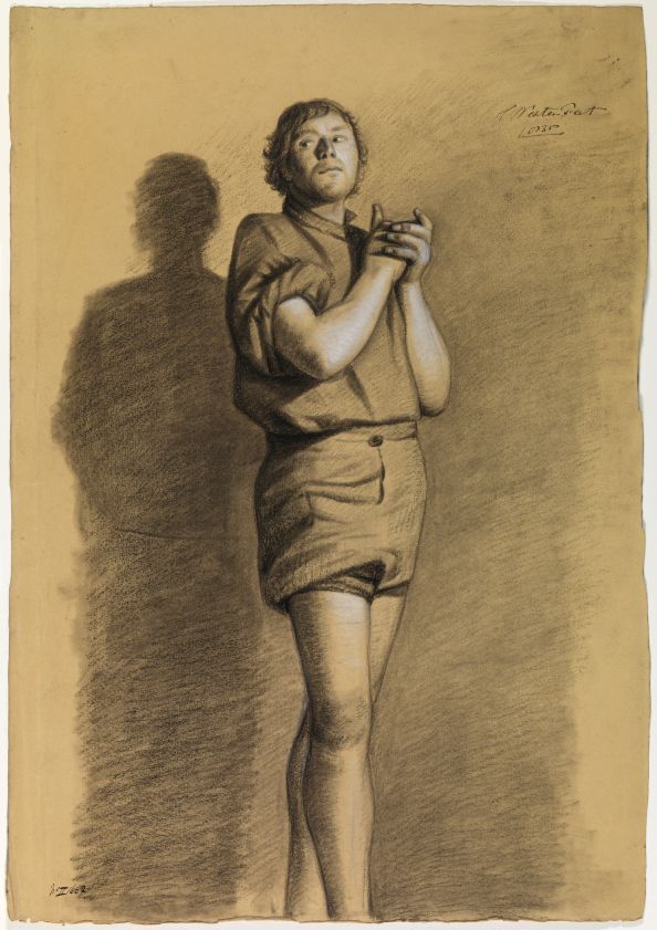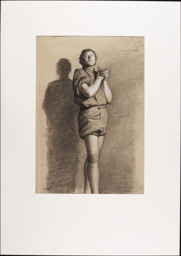 Academische studie van een jongeman met omgeslagen mouwen en opgestroopte broek