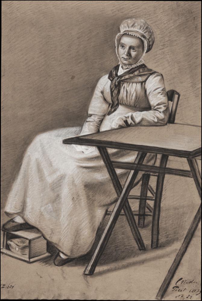 Studie van oude vrouw, zittend aan tafel met stoof