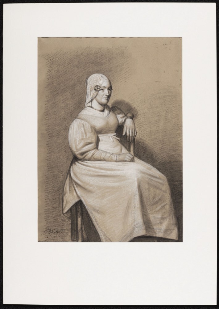 Vrouw in Fries kostuum, zittend op een knopstoel