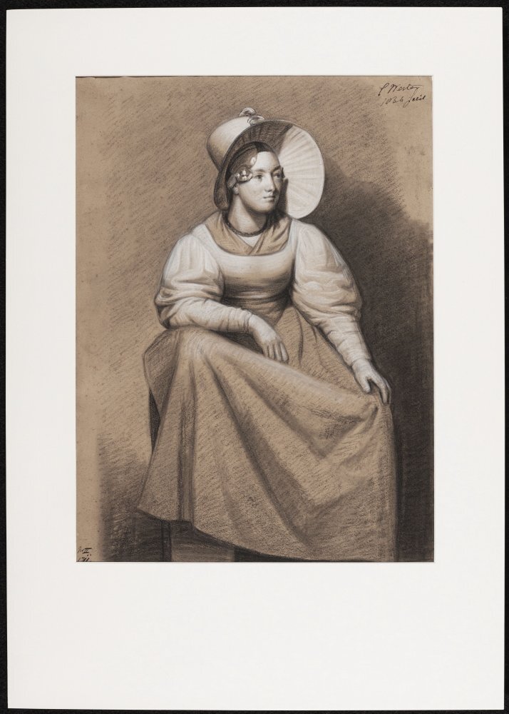 Zittende jonge vrouw met grote hoed