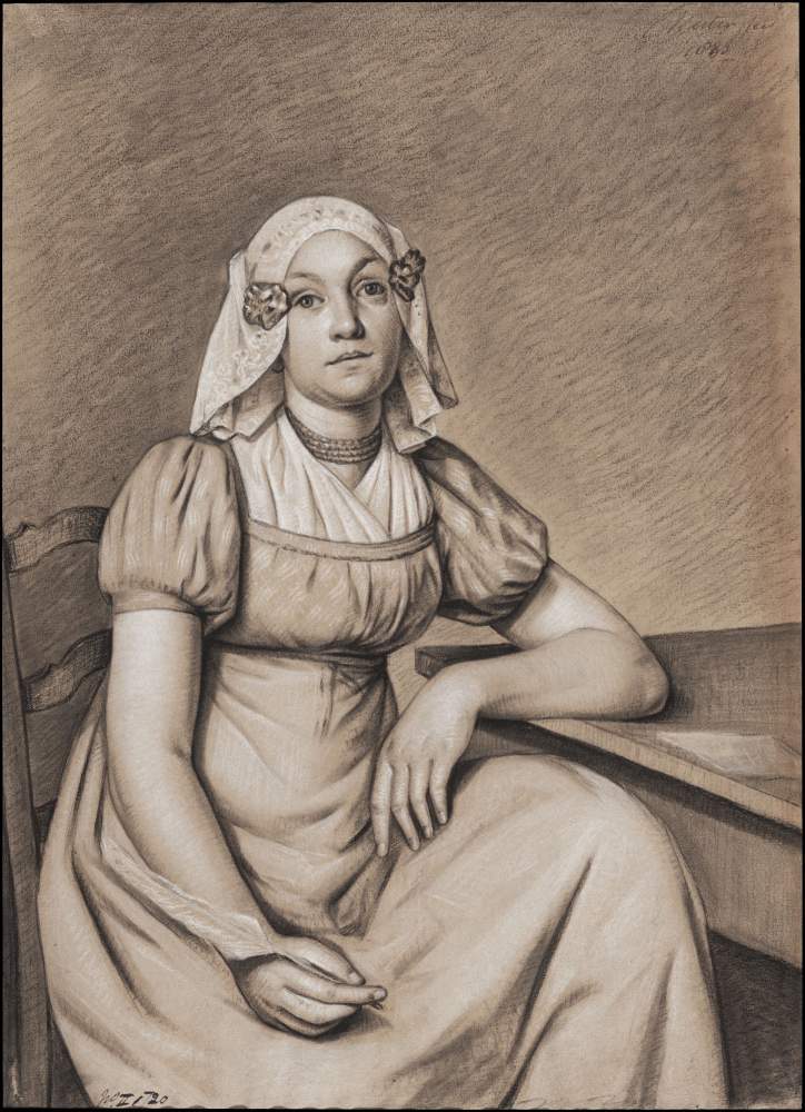 Vrouw in Fries kostuum zittend aan bureau met ganzeveer