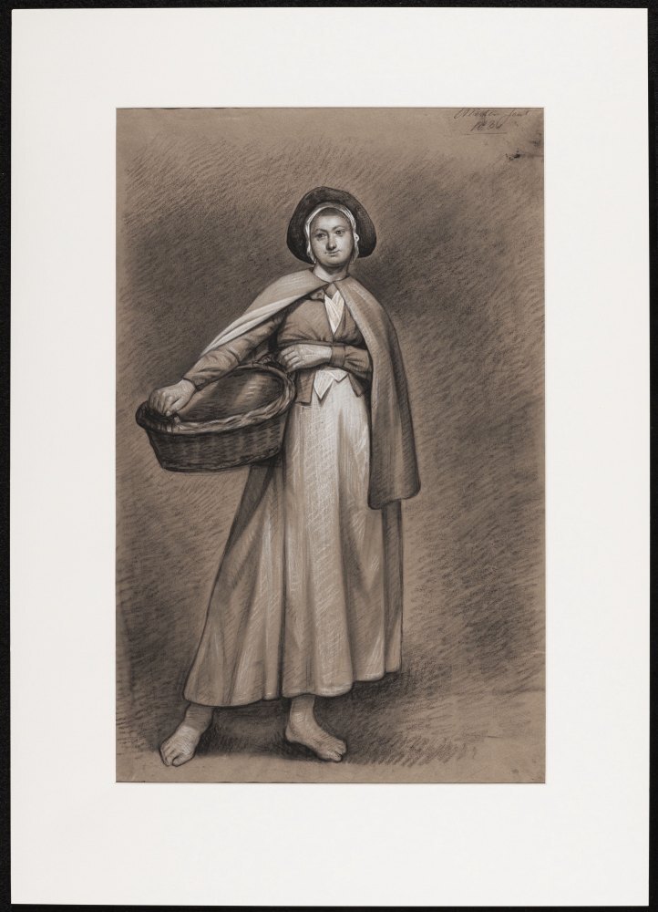 Staande vrouw in Fries kostuum met muts en mand