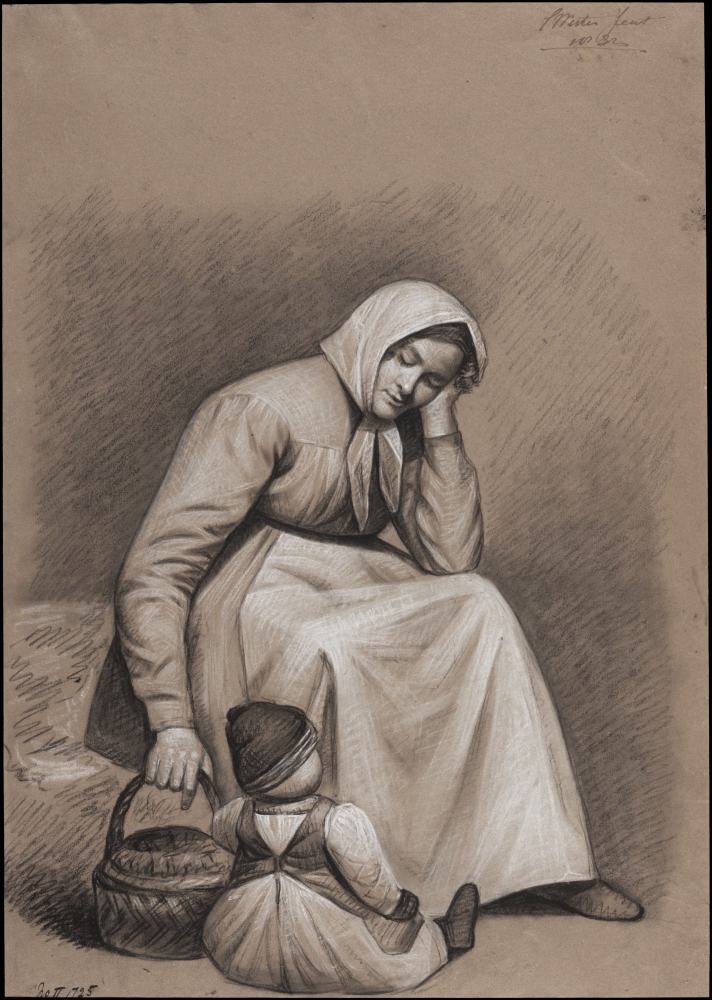 Vrouw in Fries kostuum, zittend met hoofddoek en kind