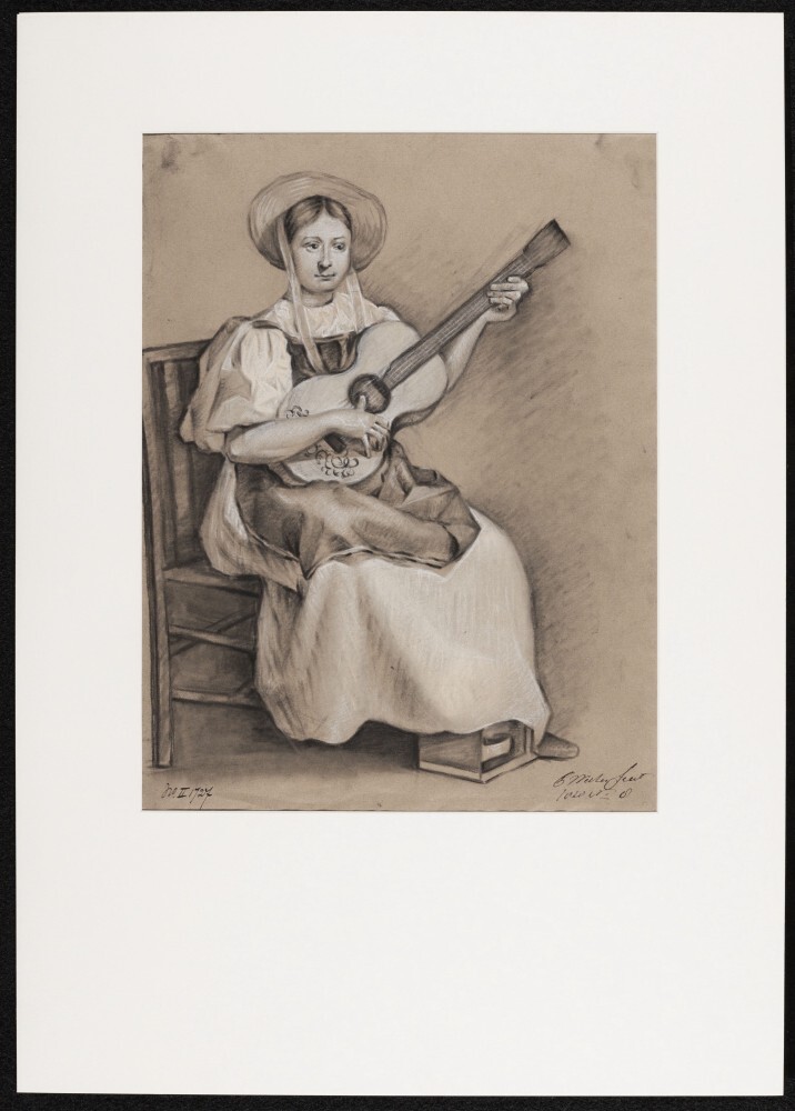 Gitaarspelende jonge vrouw, zittend op stoel