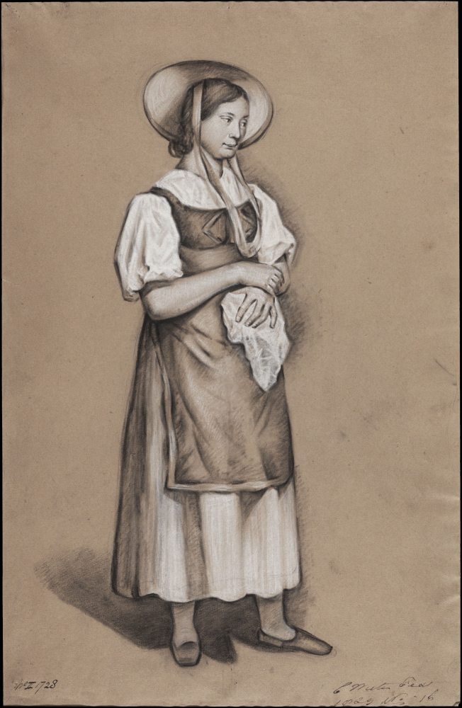 Staande vrouw met hoed en schort en in linkerhand een doek