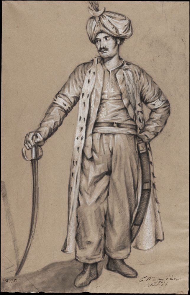 Man in oosters gewaad, met tulband en zwaard