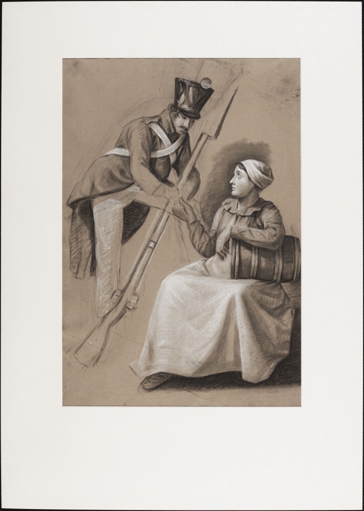 Soldaat met geweer naast zittende vrouw