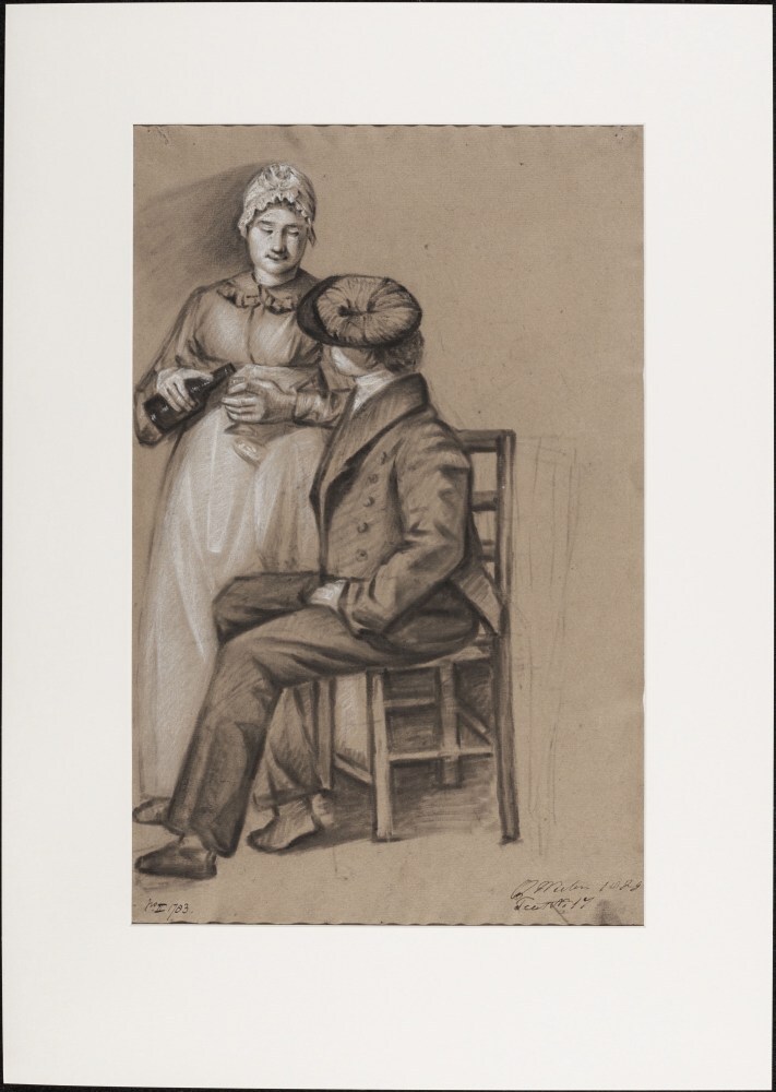Staande vrouw, drank inschenkend naast een man met pet zittend op stoel
