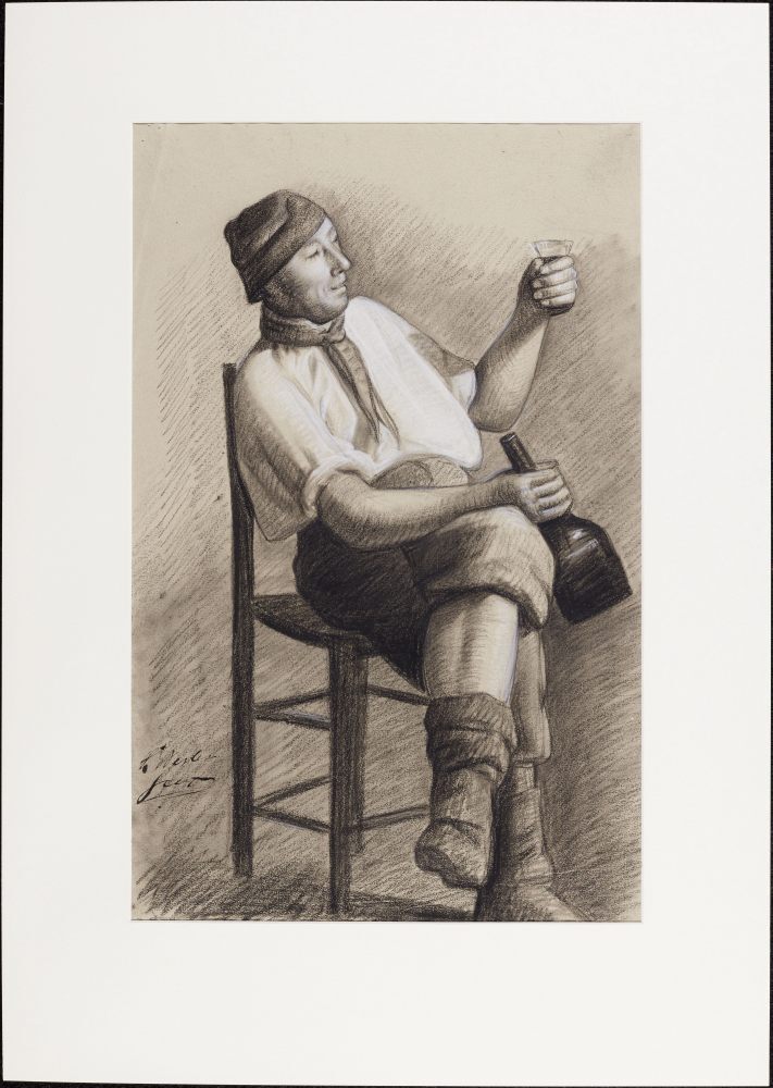 Zittende drinkende man, met kniebroek