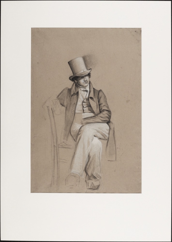 Onvoltooide tekening van man met hoge hoed op een stoel