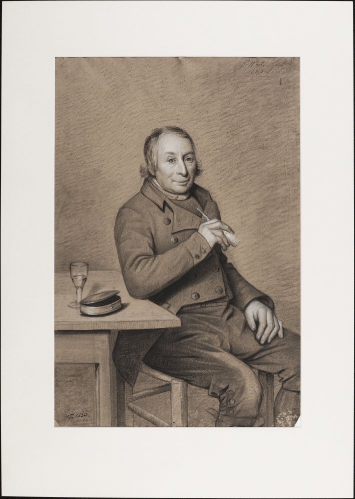 Oude man met pijp, zittend aan een tafel met tabaksdoos en borrel