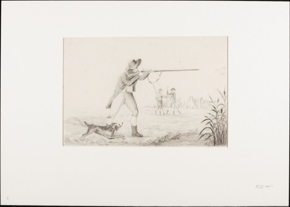 Landschap; Jachttafereel jager met hond