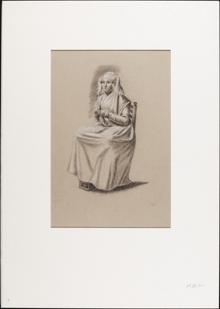 Zittende vrouw in Fries kostuum