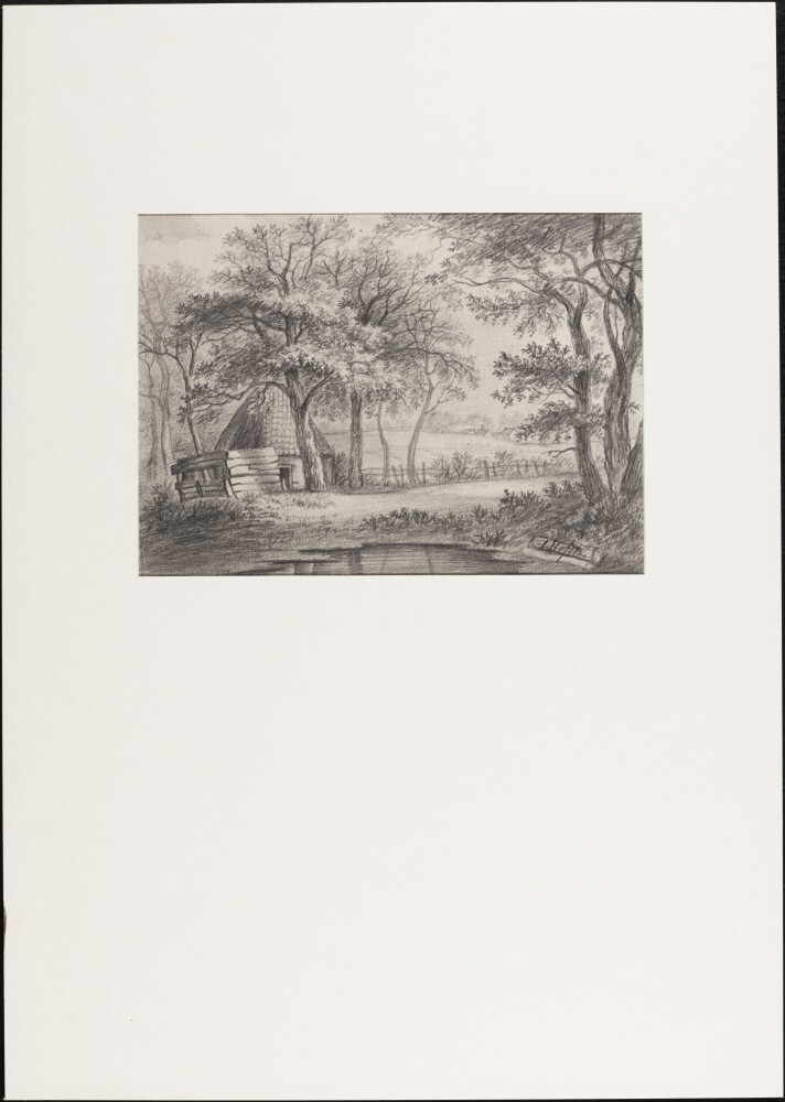 Hutje, bomen en meertje