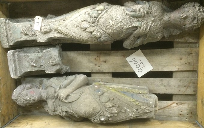 Twee in steen gehouwen cariatiden, de ene een man en de andere een vrouw