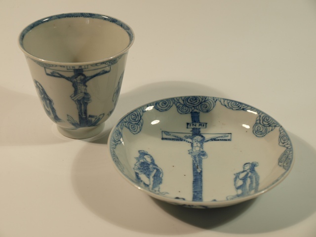 Kop en schotel van blauw Chinees porselein met voorstelling van Jezus aan het kruis