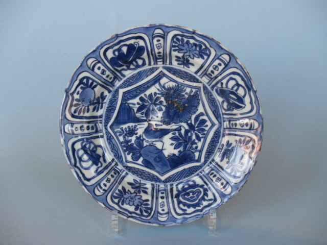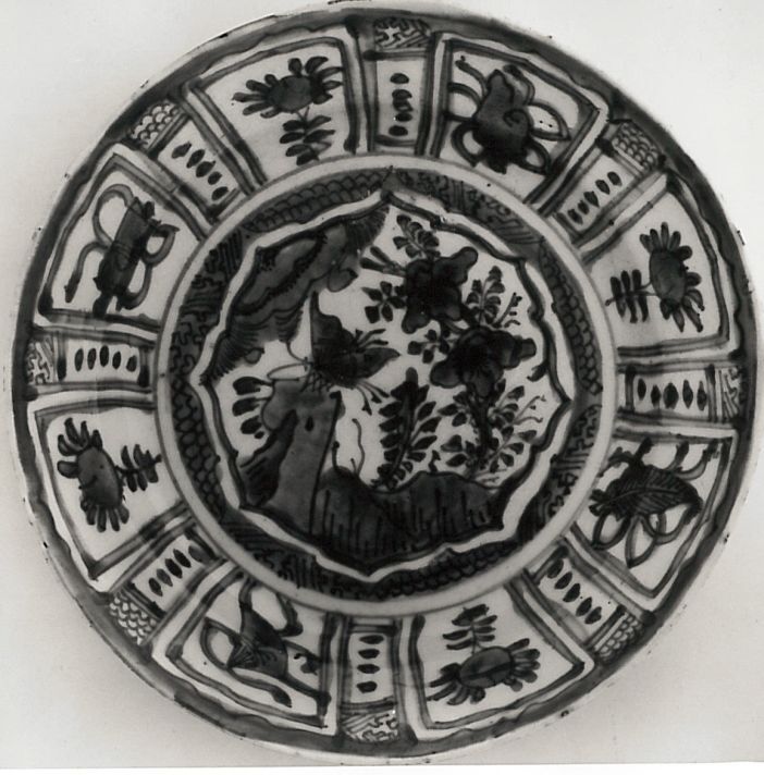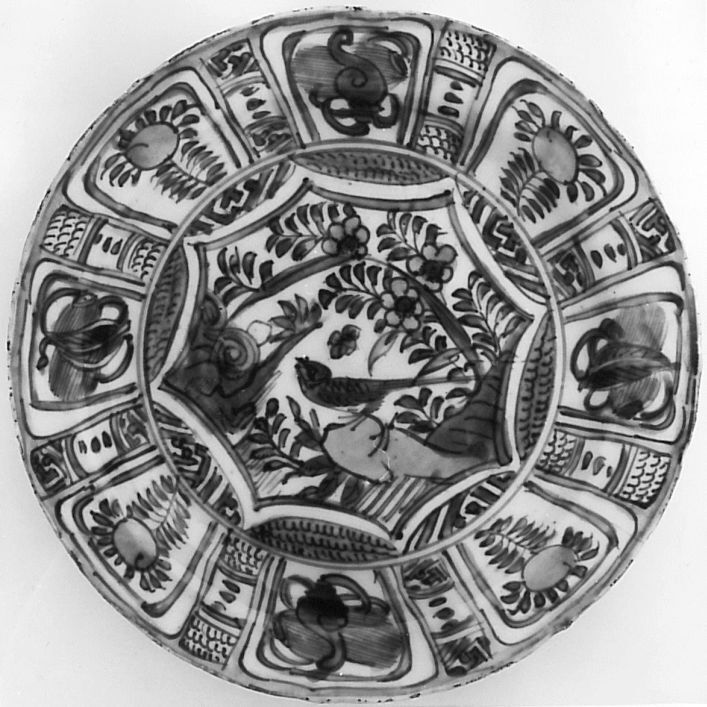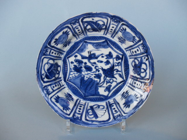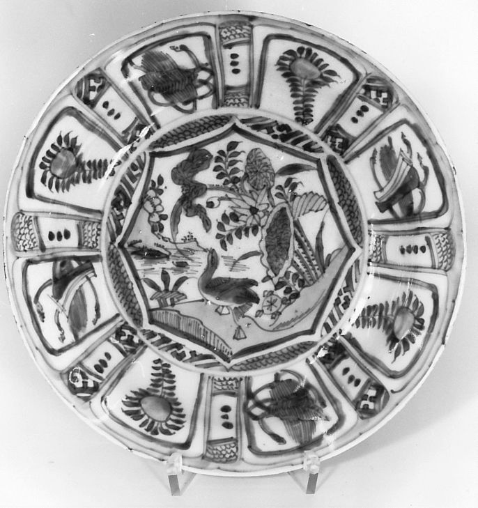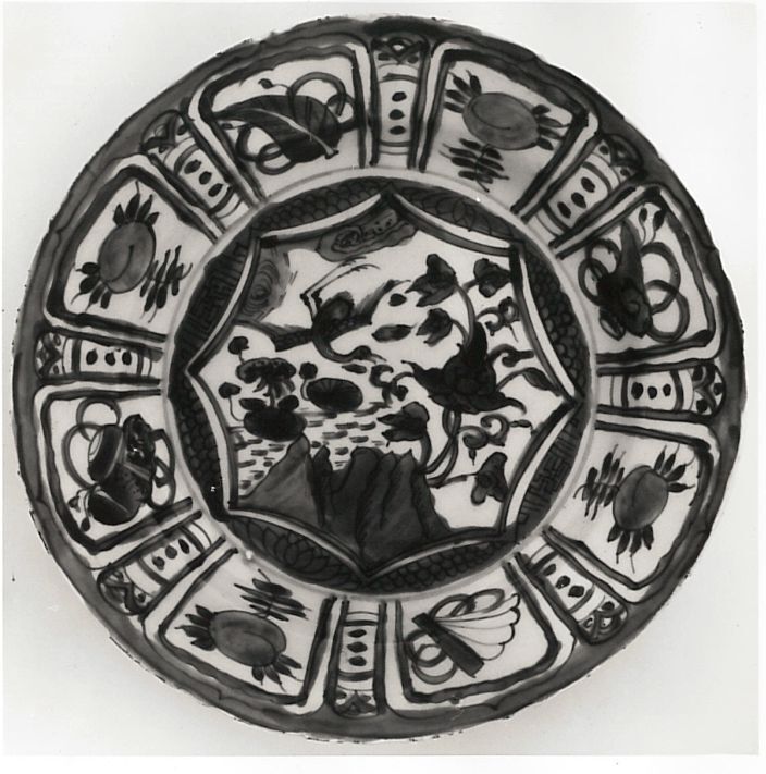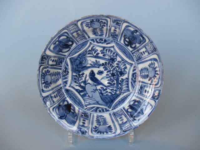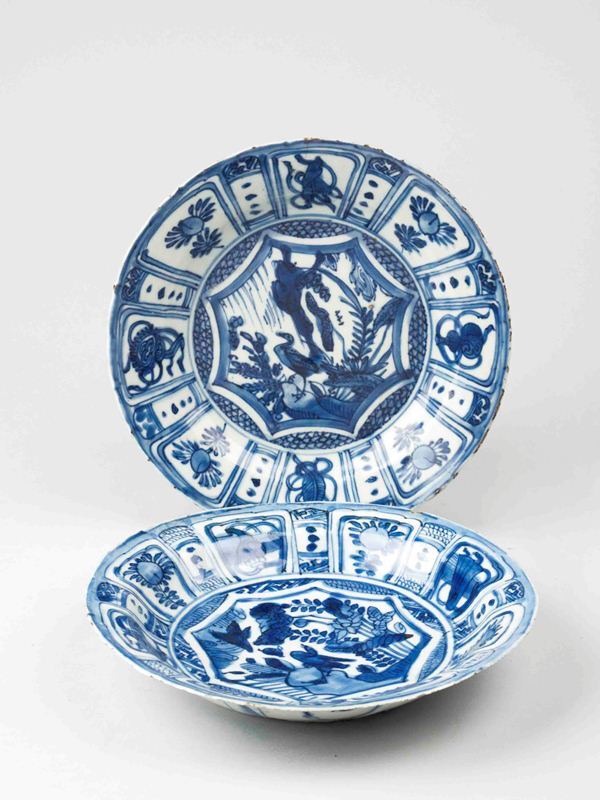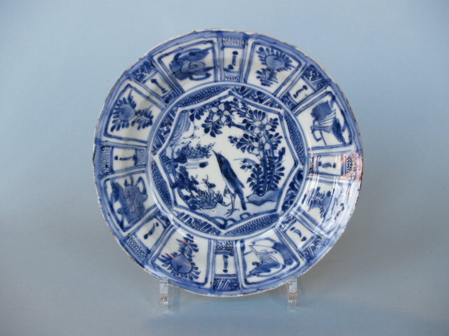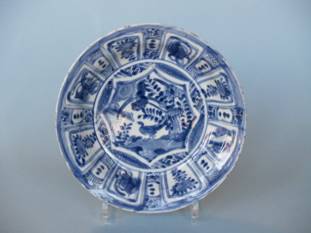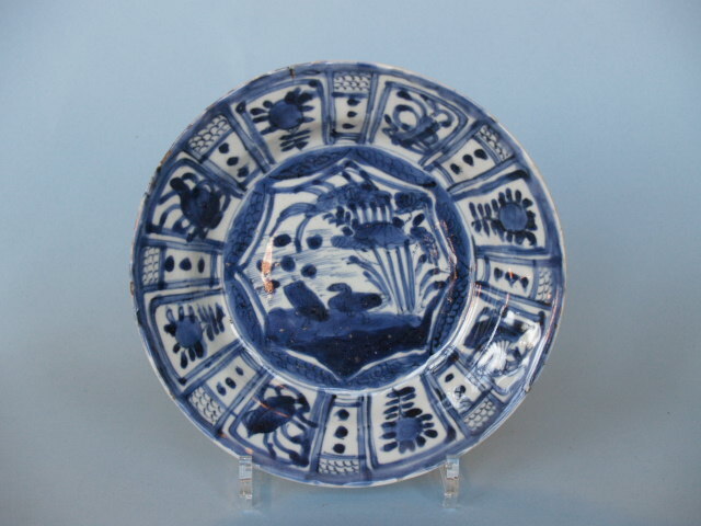 Vijftien borden van blauw Chinees porselein waarop waterrijk landschap met waterplanten, eenden en in de lucht een roofvogel