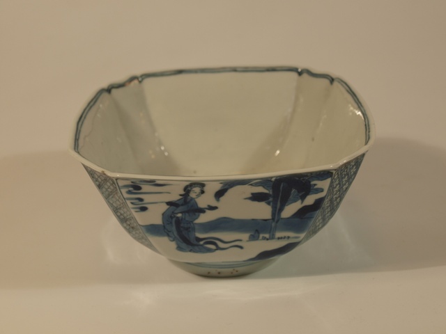 Vier vierkante kommen van blauw Chinees porselein met platte aan de rand gekartelde hoeken