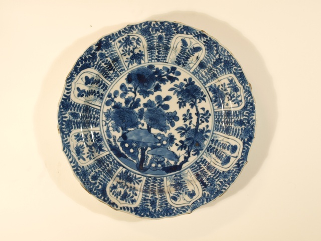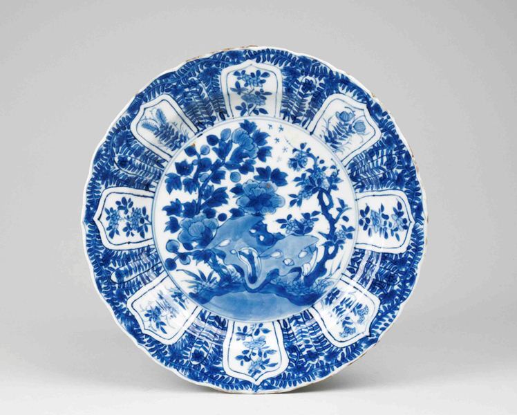 Zes borden van blauw Chinees porselein met decor van bloem- en boommotieven