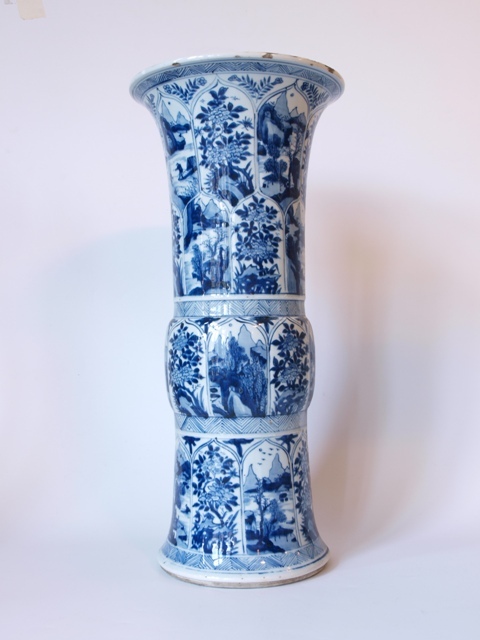Vijfdelig stel van blauw Chinees Kangxi porselein, bestaande uit drie potten met deksels (1 deksel Delfts gemerkt) en twee bekers, versierd met landschappen.