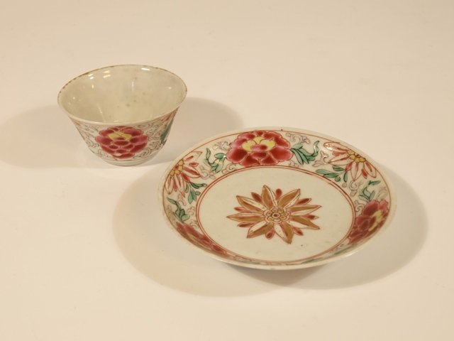 Vijf kopjes en vier schotels van gekleurd Chinees porselein