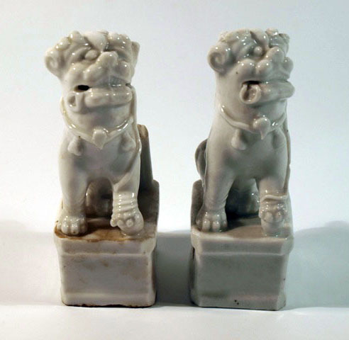 Twee beeldjes van leeuwtjes of hondjes van wit Chinees porselein