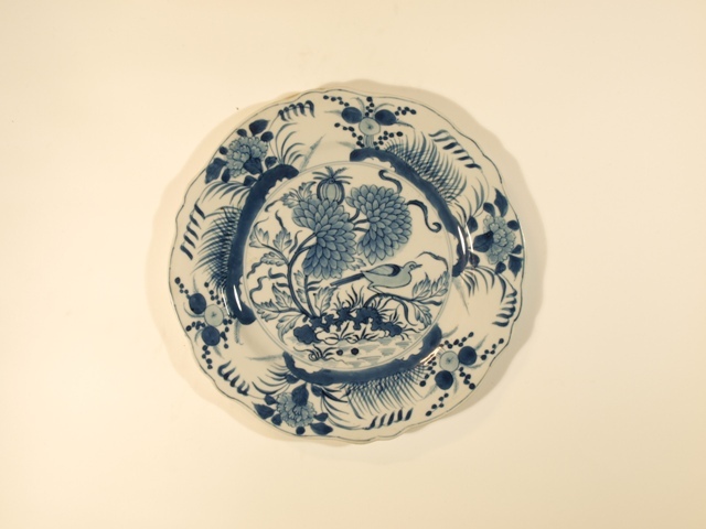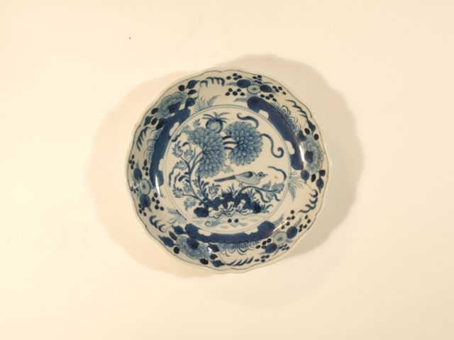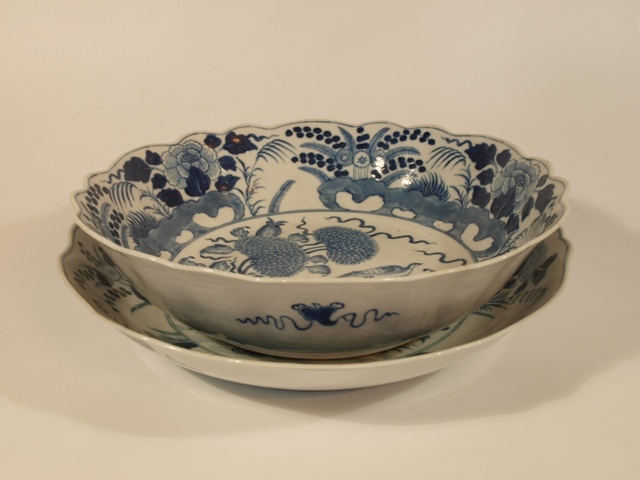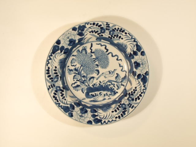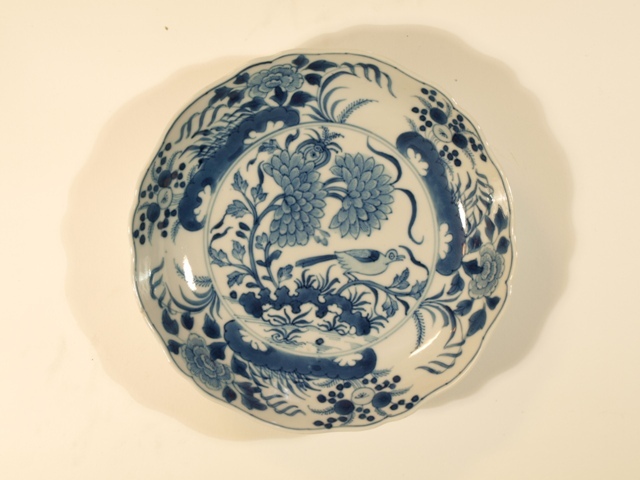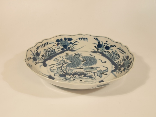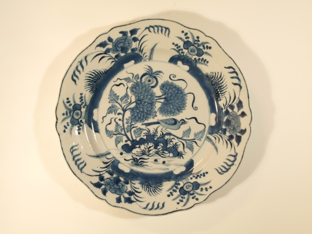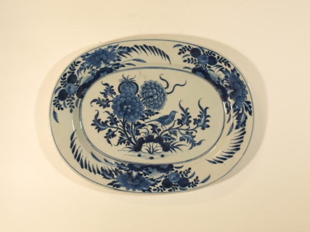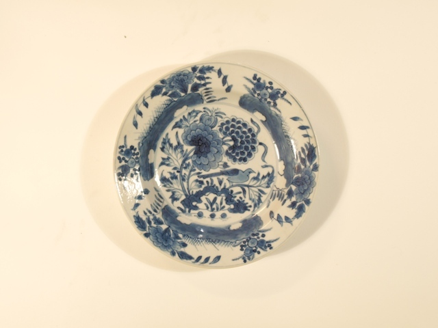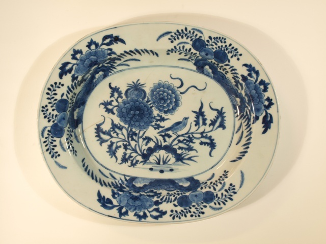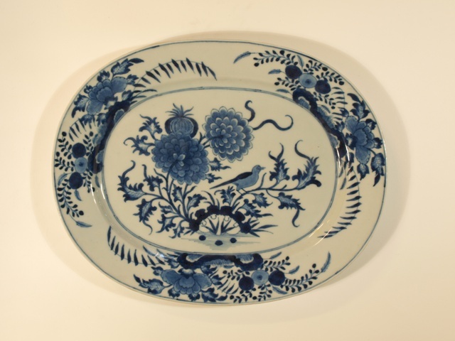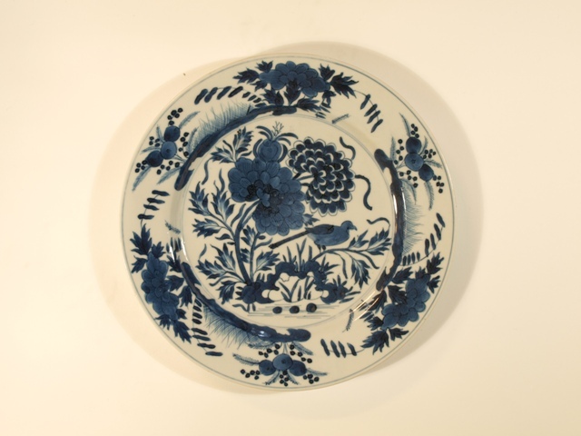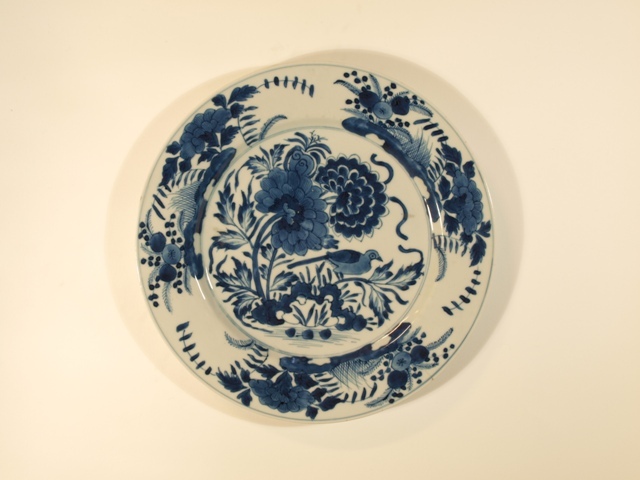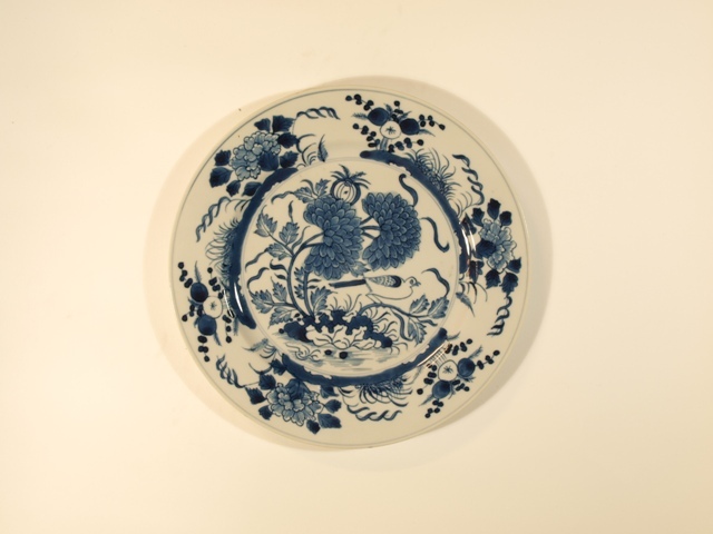 Eetservies van blauw Chinees porselein versierd met blad- en bloemwerk waartussen een vogel