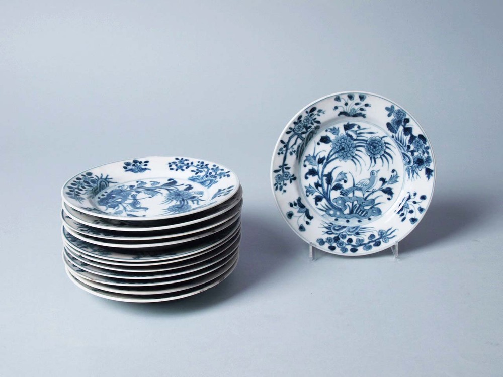 Twaalf kleine dessertbordjes van blauw Chinees porselein versierd met blad- en bloemrank, zonnebloem en vogel