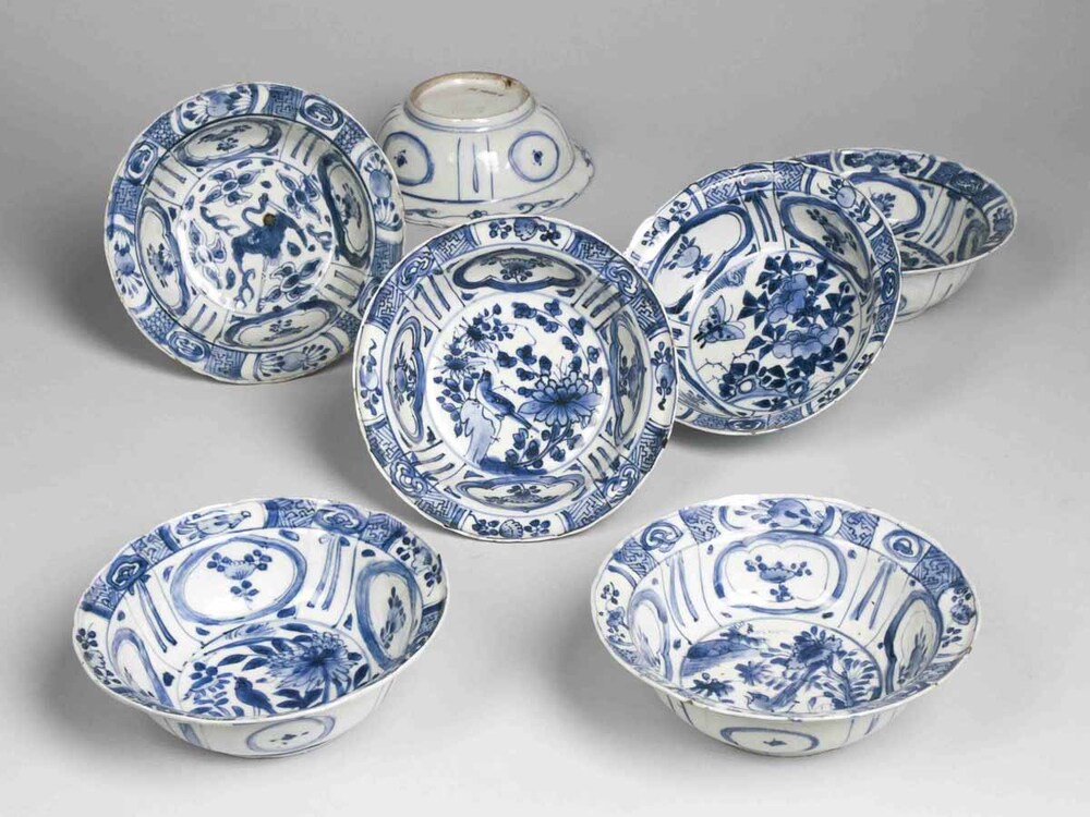 Zeven kleine diepe schaaltjes van blauw Chinees porselein met vlakke rand, middenwerk versierd met bloemen en takken