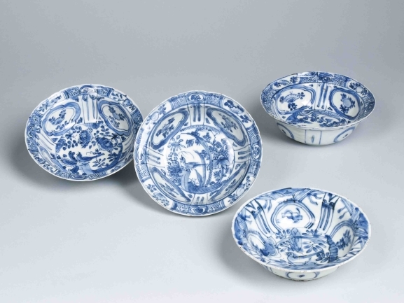 Set van vier diepe schaaltjes van blauw Chinees porselein waarop bloemen en een vogel