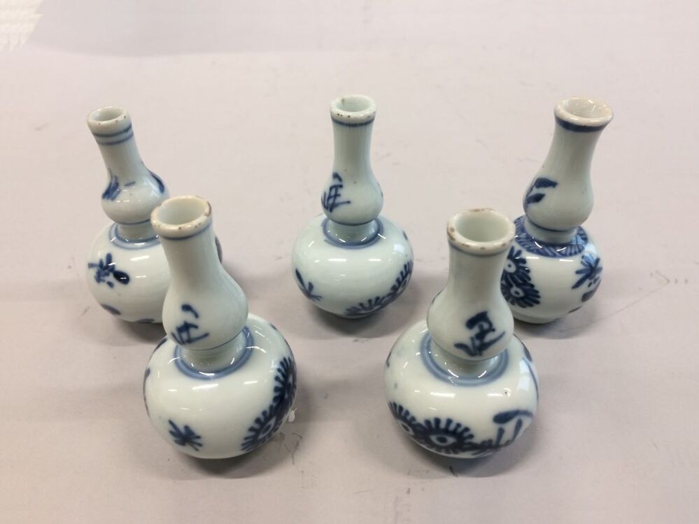 Vijf kleine knobbelvaasjes van blauw Chinees porselein