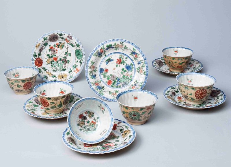 Zes kopjes en zes schoteltjes van Chinees porselein waarop bloemen, bladeren en vlinders