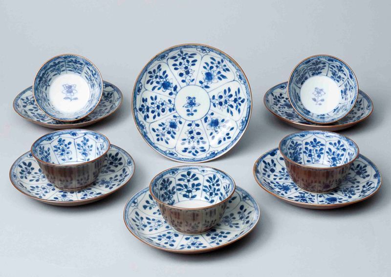 Vijf kopjes en zes schoteltjes van Chinees porselein waarop bomen en bloemtakken
