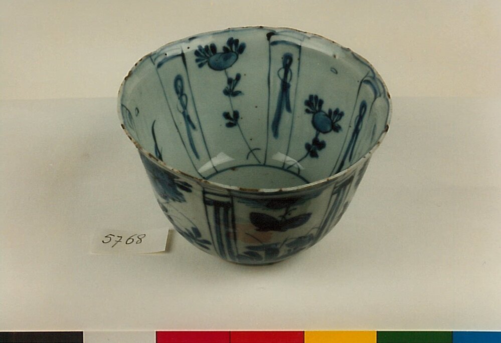 Zes diepe kommen van Chinees porselein met blauwwit decor van bloemen, vogels, landschappen met herten, vlinders en Chinese symbolen