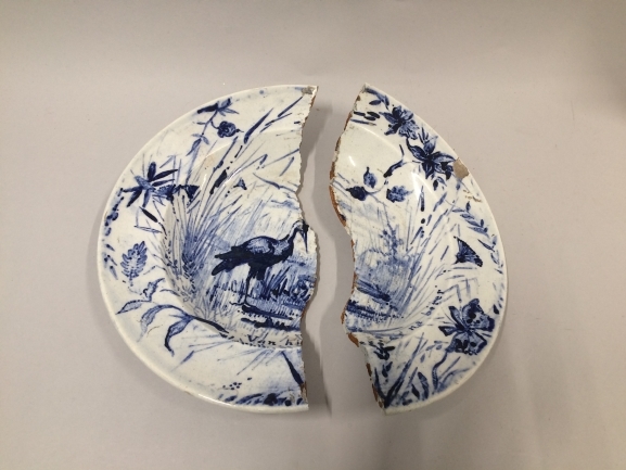 In twee delen gebroken diep bord van Delfts blauw aardewerk