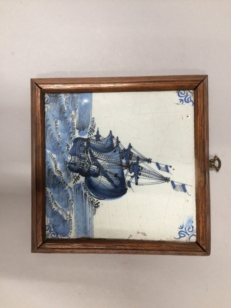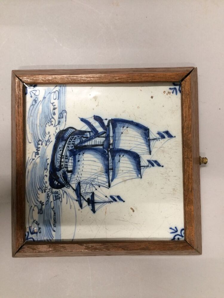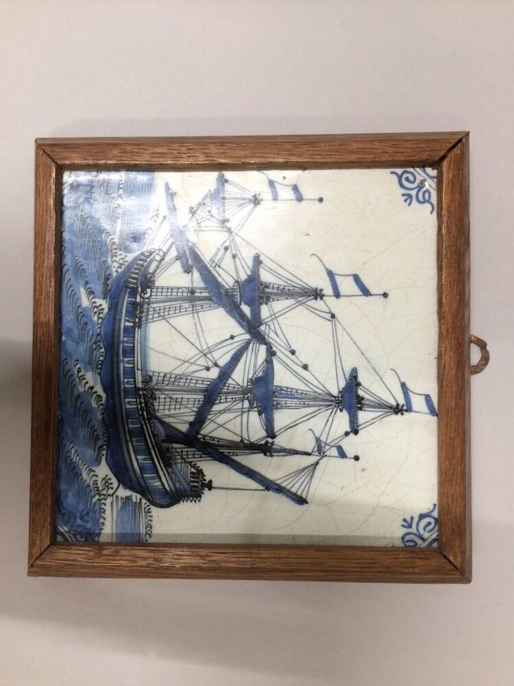 Drie tegels in lijst met zeilend schip