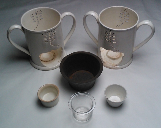 Twee komforen en ketel van twee komforen met ketel en doofpot