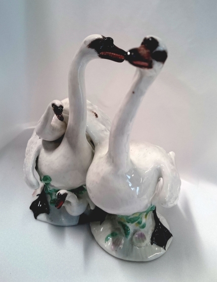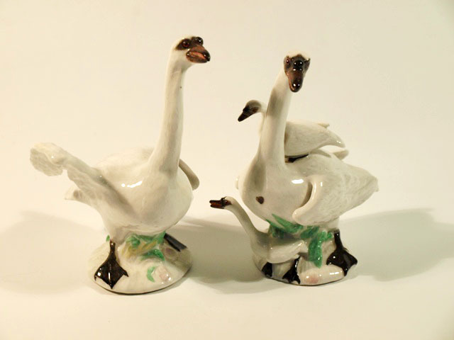 Twee beeldjes van zwanen waarvan de één de ander, met jongen, kan omhelzen