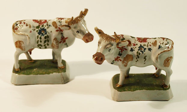 Een van twee beeldjes van koeien van Delfts aardewerk met beschildering van bloemmotieven