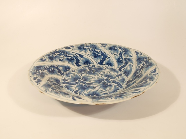 Twee grote schotels van blauw Chinees porselein met bladmotieven in schuin lopende vakverdeling