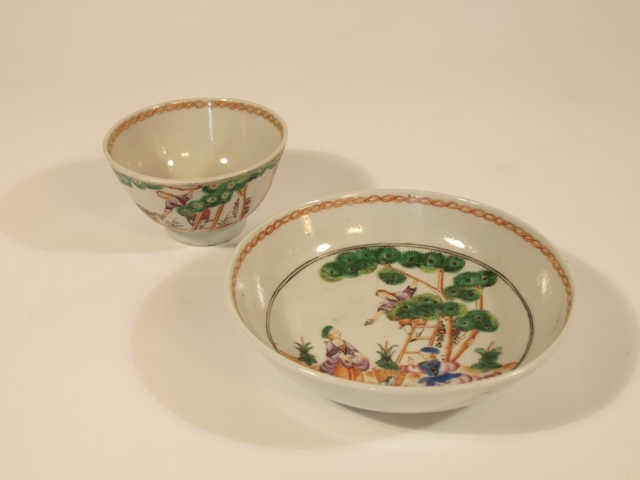 Vijf kop en schotels van divers formaat van gekleurd Chinees porselein