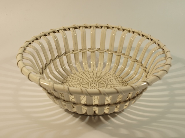 Twee fruitschalen met onderschotels met openwerk en imitatievlechtwerk