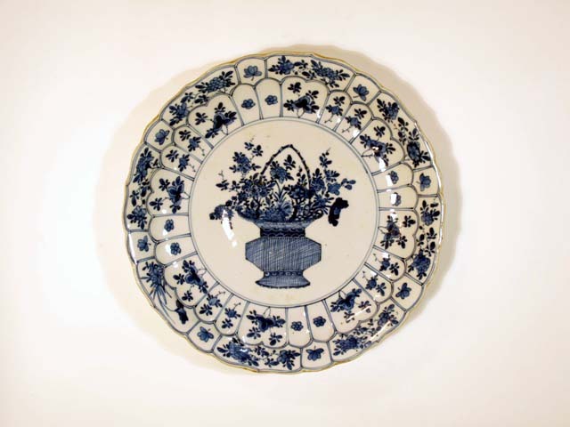 Zeven diepe geschulpte schotels met licht gekartelde rande met bloemenmand versiering