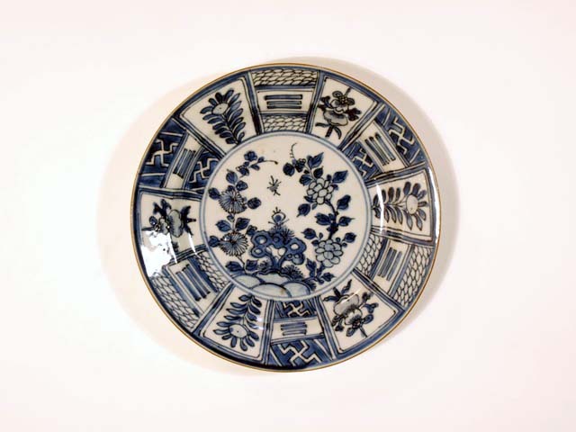 Vijf kleine diepe bordjes van blauw Chinees porselein met vakversiering en florale motieven