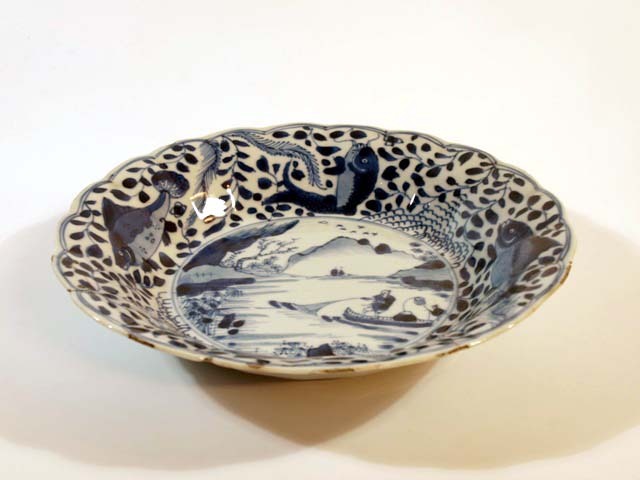 Drie diepe schotels met geschulpte rand van blauw Chinees porselein met vissen in de rand en landschap met Chinezen in middenvlak