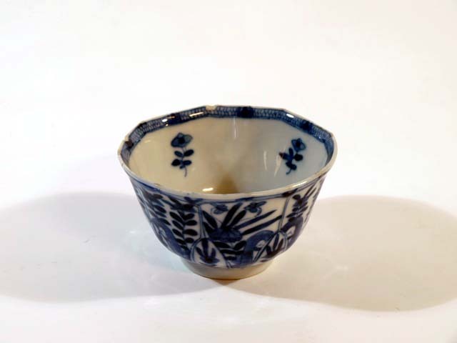 Vier kopjes van blauw Chinees porselein met bloem- en bladranken