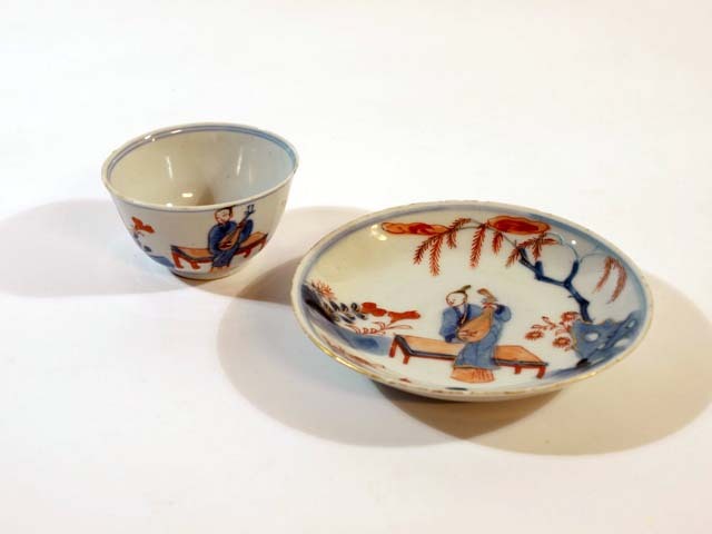 Vier kopjes en vier schoteltjes van gekleurd en goud Chinees porselein met Chinezen in landschap