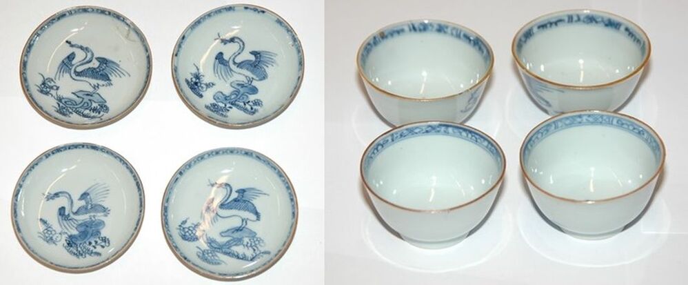 Vier kopjes en 6 schoteltjes van blauw Chinees porselein met draak