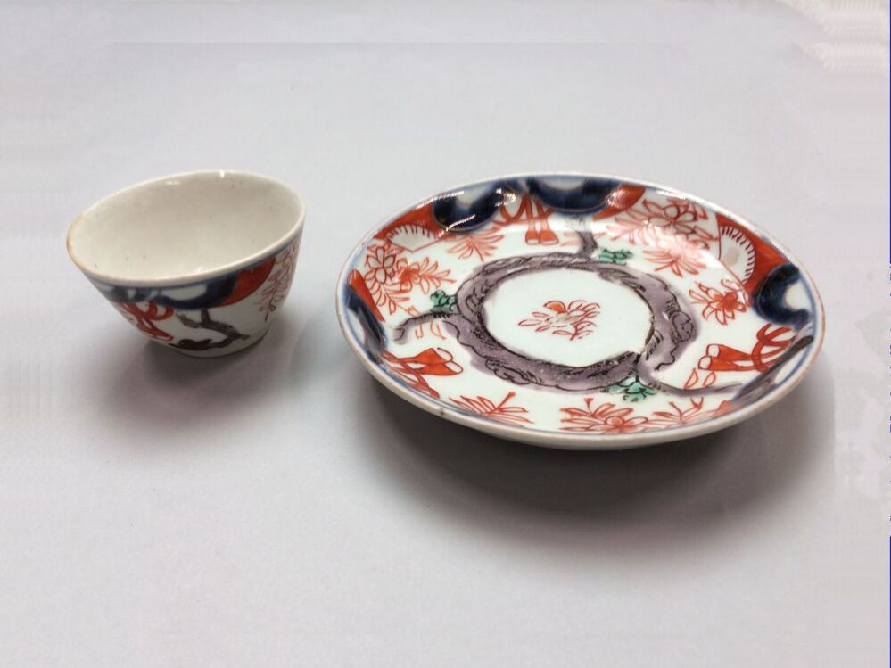 Vijf koppen en vijf schotels van vijf kop en schotels met polychroom decor