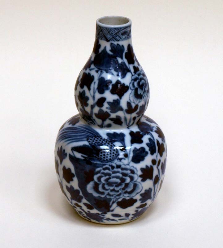 Twee knobbelflessen van blauw chinees porselein, met pauw en bloemversiering.